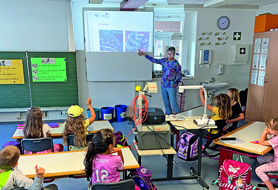 Und schon holt Martin ein Buch, probiert es aus und legt es unter die Kamera und die farbigen Bilder erscheinen. Auch die kleine „echte“ Ringelnatter wird sofort getestet und auch hier konnten die Kinder sogar die Augen und Farbe gut erkennen. Die Klassenlehrerin Frau Rodamer ist begeistert von den Möglichkeiten. Gerade in der Pandemie-Zeit und den einzuhaltenden Abständen zu den Schulkindern können so auch praktische Arbeitsübungen wie Häkeln direkt über diese Kamera allen gut visualisiert werden.